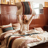 Das Design zeichnet sich durch zwei markante Streifen aus, die sich über die gesamte Breite der Decke erstrecken. Der größere Streifen kombiniert Lederbraun, Fichtengrün, Altrosa und Senfgelb, während der kleinere Streifen Fichtengrün, Altrosa und Knochengrau kombiniert. Diese dezente Farbpalette sorgt für einen stilvollen und dennoch warmen Look.